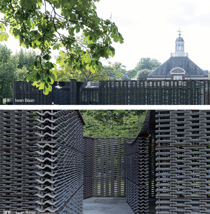 我們都知道,水泥瓦一般用作普通民房或者高檔別墅的屋頂建設(shè),但是設(shè)計師弗里達、埃斯科韋多設(shè)計的蛇形展亭,以水泥瓦建造,這種水泥瓦一般用于建造屋頂,顏色偏深而且具有獨特的質(zhì)感。展亭將水泥瓦以左右錯位、類似植物的排列方式堆疊,形成帶有墨西哥特色的鏤空墻幕。展亭的庭院中還設(shè)一個三角形的水池,屋頂?shù)紫聞t以鏡面鋪就,在日光照射下將呈現(xiàn)不同的視覺效果。展亭的中軸線從南延伸至北,與數(shù)英里以外的格林威治子午線的方向契合,以此強調(diào)展亭同時也是“時間儀”的這一特質(zhì)。
